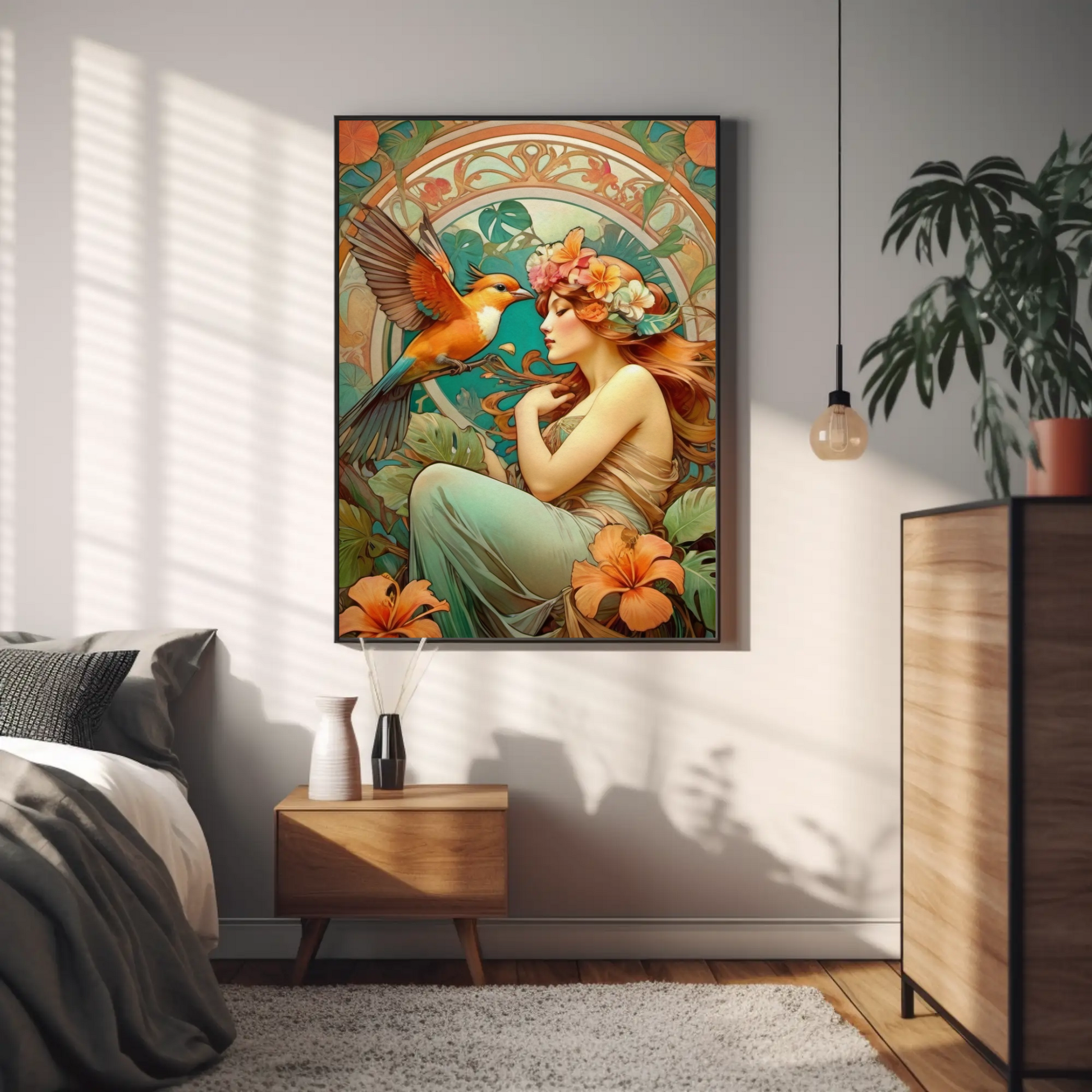Beautiful Portrait of a Woman in Art Nouveau Style - Tropical Birds - Digital Download
