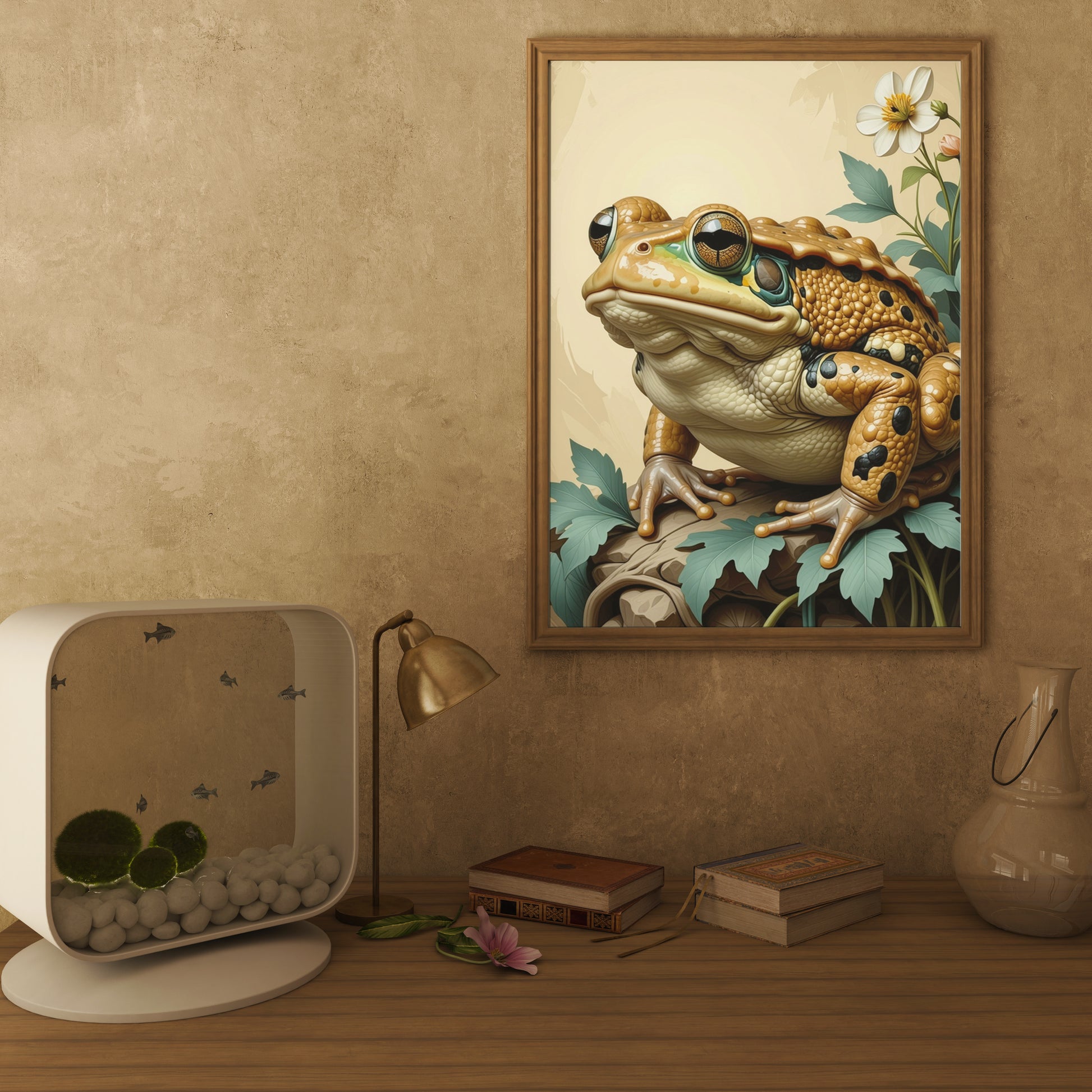 Idyllic Frog with Leaves and Flowers Cottage Style Art Print - Digital Download